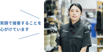 接客販売スタッフとして、主にお客様の普段の使い方に合わせたタイヤやホイールを提案します。さらに、ETCやドライブレコーダー、その他用品のご案内や販売フォローも行います。笑顔で接客しながら、お客様が安心して選べるようサポートすることが私の役割です。