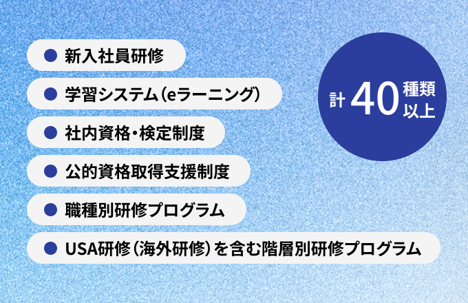 入社後は基礎から学べる新入社員研修に始まり、eラーニングや職種別研修など、40種類以上の教育制度を用意。先輩がついて指導するOJT制度も充実しているので、未経験からでも安心して成長できます。社内資格や国家資格の取得支援もあり、スキルアップを目指す方にぴったりの環境です。