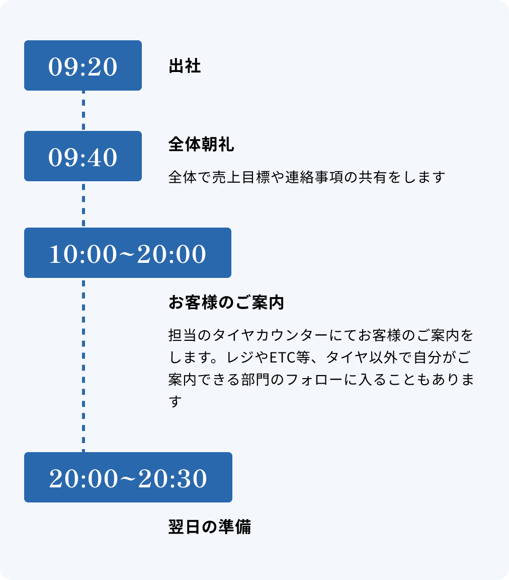 タイヤを中心に、お客様に最適な提案をする販売スタッフです。