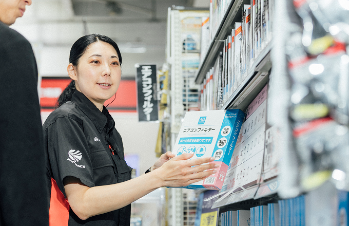 ご来店されたお客様にレジでの会計や商品のご案内を行います。お客様の「困った」を解決するのもこの業務の醍醐味。たとえば「雨の日に視界が悪い」と相談を受けた際は、ワイパーや撥水剤などを提案するなど、会話を通じて信頼関係を築いていきます。
